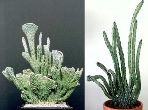 Veya, diğer bilimsel adıyla Monvillea Spegazzinii f. Cristata.. İnsanlar bu kaktüsün esas türünü normal ince dallı olarak yetiştirirken bir gelişim bozukluğu (somatik mutasyon) sonucu kaktüsün bir kısmı krestata (horoz ibiği biçimi) şeklinde gelişmiş. Biraz gelişince ondan parçalar alıp çoğaltmışlar. Böylece Cereus spegazzinii f. cristatus çeşidi ortaya çıkmış. Bunlar makbul tutulur. Ve krestata formundakiler, kendi tarzında gelişip büyümelerinin yanısıra normal çubuk dallar da uzatırlar. Eğer krestata formunun bozulmasını istemiyorsanız dal gibi gelişen tüm filizlerini yok etmelisiniz.